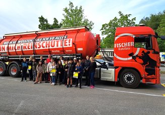 Der Anhalteweg des Lkw, der Schutzweg, der Sicherheitsabstand sowie der tote Winkel oder das „Ausscheren“ in Kurven werden dabei anschaulich direkt am Objekt demonstriert – mit Bodenkennzeichnungen, „Verkehrshütchen“ und durch die Überprüfung der Sichtverhältnisse aus dem Führerhaus durch die Kinder selbst. Selbst am Steuer eines Lkw zu sitzen ist für die Kinder üblicherweise das Highlight der Veranstaltung, auch wenn es eigentlich mit einem Lernauftrag verbunden ist.