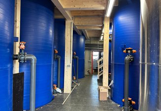 Die neue Anlage wurde in einem bestehenden Raum mit einer Grundfläche von ca. 90 m² errichtet. Der Raum ist als dichte Betonwanne ausgeführt -wie eine riesige Badewanne. 75 % dieser Fläche werden von 11 Stück freistehenden Behandlungs- und Lagerbehältern in Anspruch genommen. Insgesamt wurde ein Nutzvolumen von 260 m³ geschaffen.