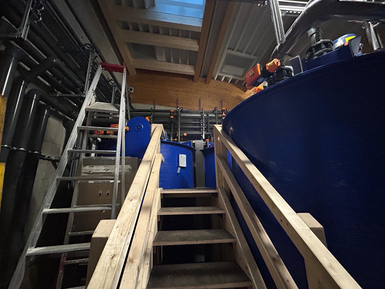 - Auf der Zwischenebene, welche ebenso wie die obere Bedienebene in Holzbauweise errichtet wurde, ist eine Drehkolbenpumpe installiert.